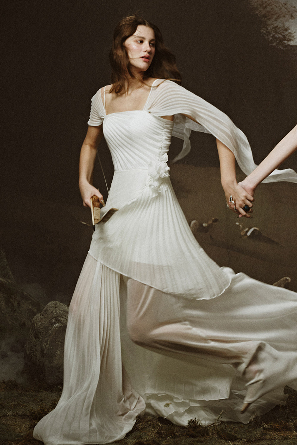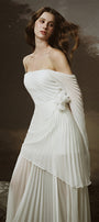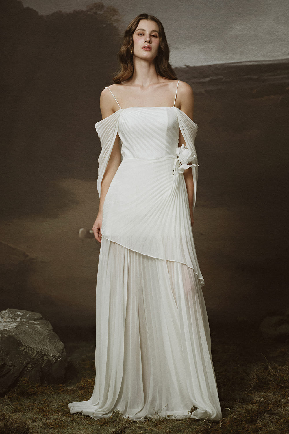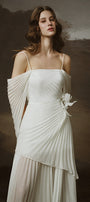 Pleated cape and bodice, Two asymmetrical layered bodice, 3D floral attched at waist, Cold shoulder cape, Spaghetti straps