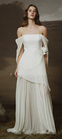 The Elysia A-line Draped Chiffon Floor Length Dress combines elegant draping and modern asymmetrical pleats for a romantic and chic look. Made of flowing chiffon, this dress is perfect for formal events and special occasions.