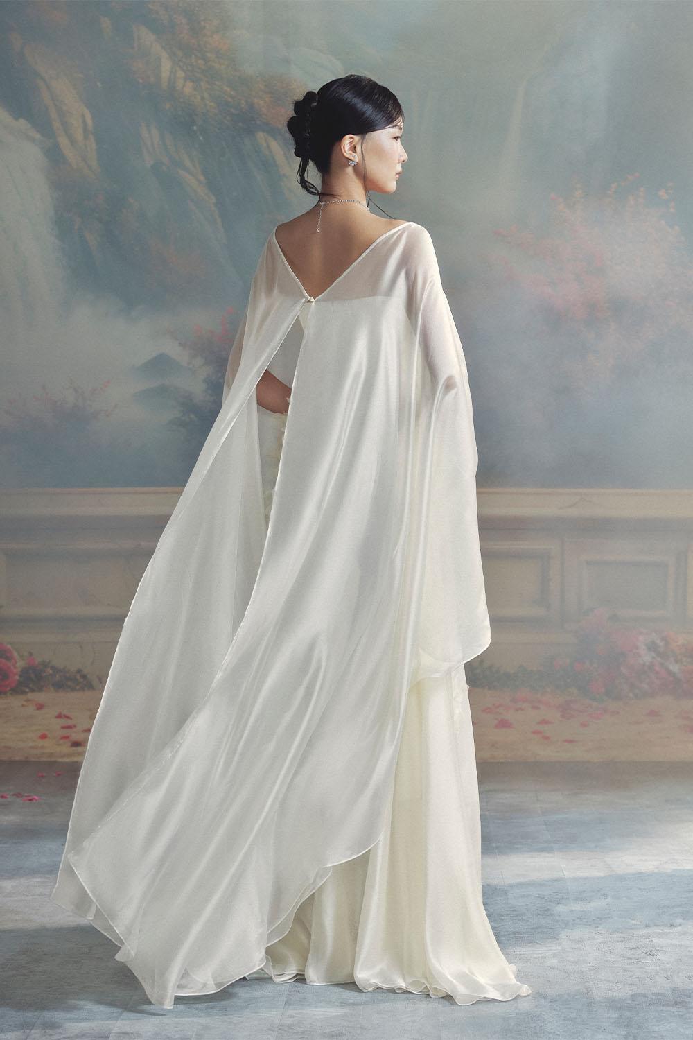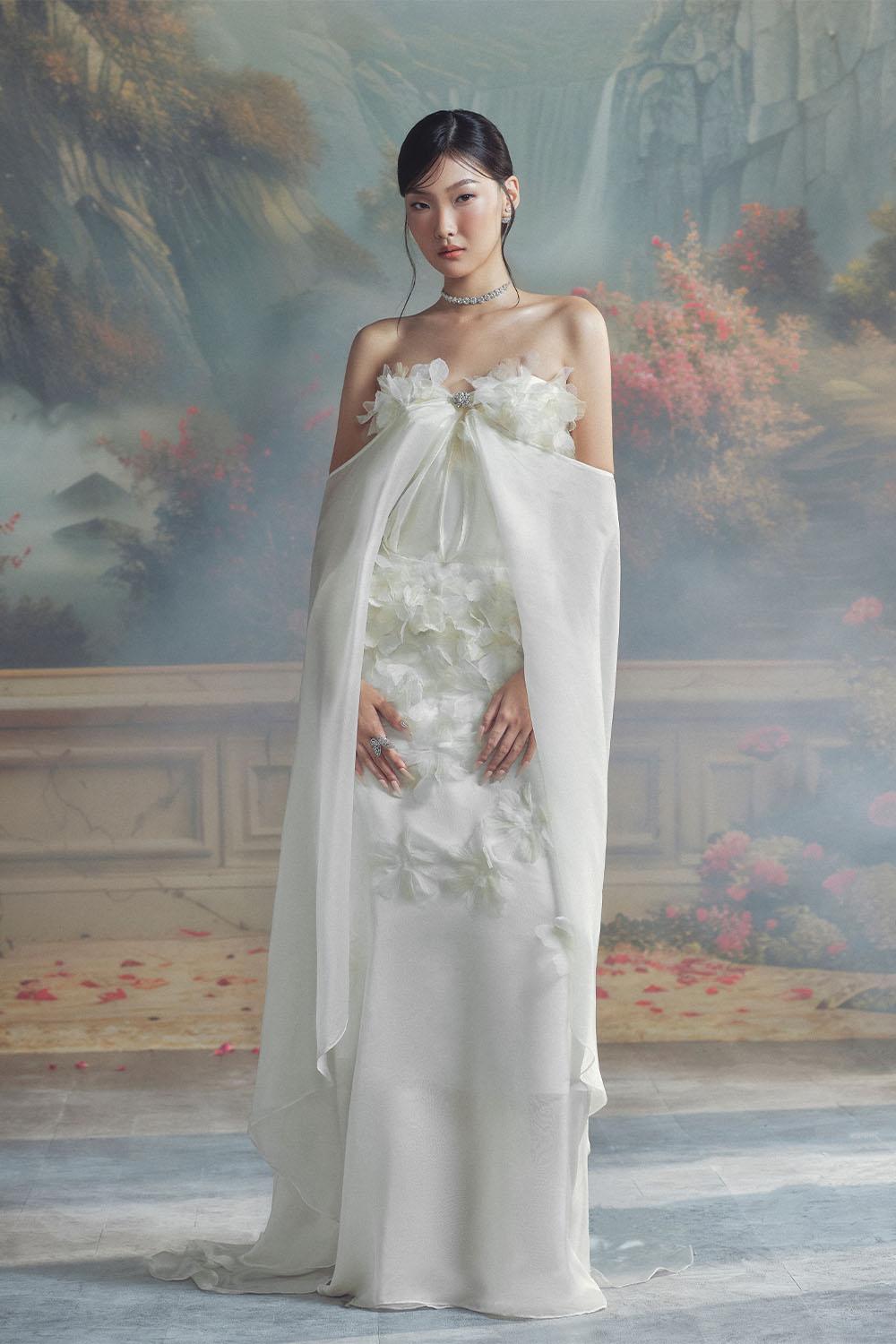 Special Features: Flexible sheer cape sleeves, 3D floral attached along the dress, Crystal button attached at the middle