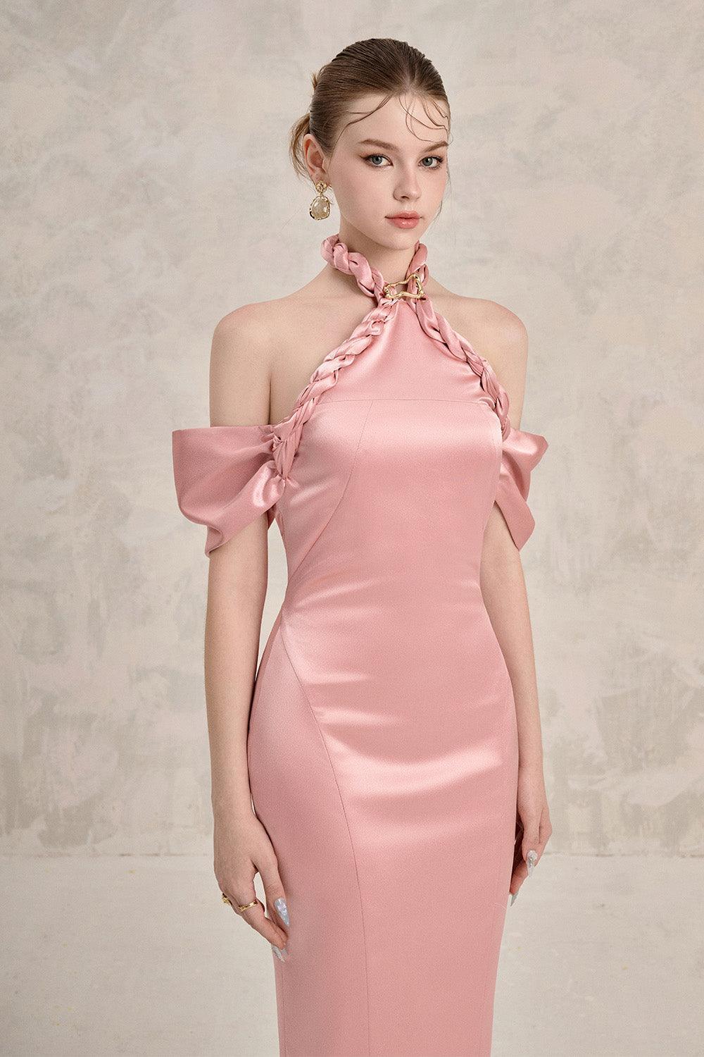 Twisted neck hem, Metallic button, Open shoulder, Back slit
