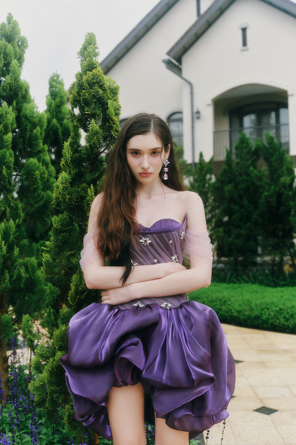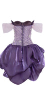 Attached rhinestones at the corset, Thigh-high slit design on the front, Corset waist