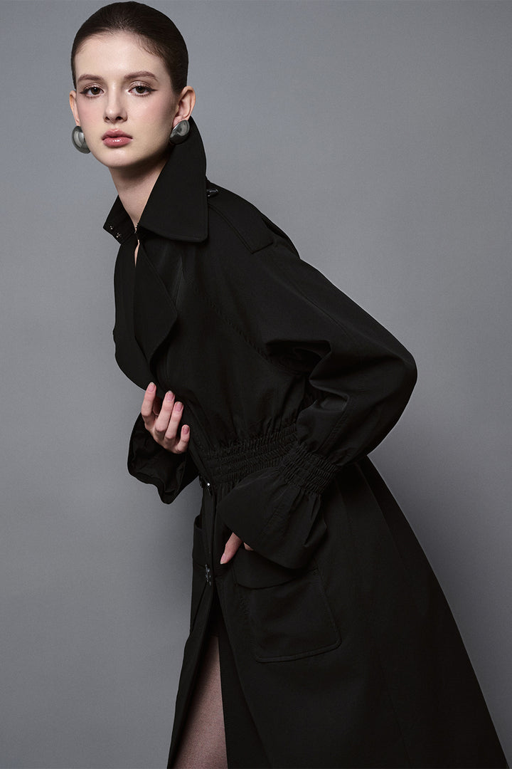 This knee-length trench coat, crafted from khaki silk, features a refined double-breasted design with a large lapel that adds timeless sophistication. The gathered waist and cuffs enhance the silhouette, providing a tailored yet comfortable fit. Functional patch pockets complete this elegant outerwear, making it a versatile choice for a polished, expert look.