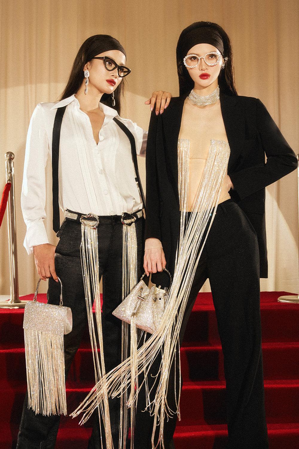 Ftont fly zipper with button, Stone tassels with ring on the waist, Attached stone on the waistband