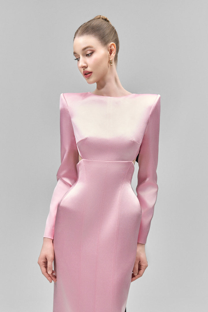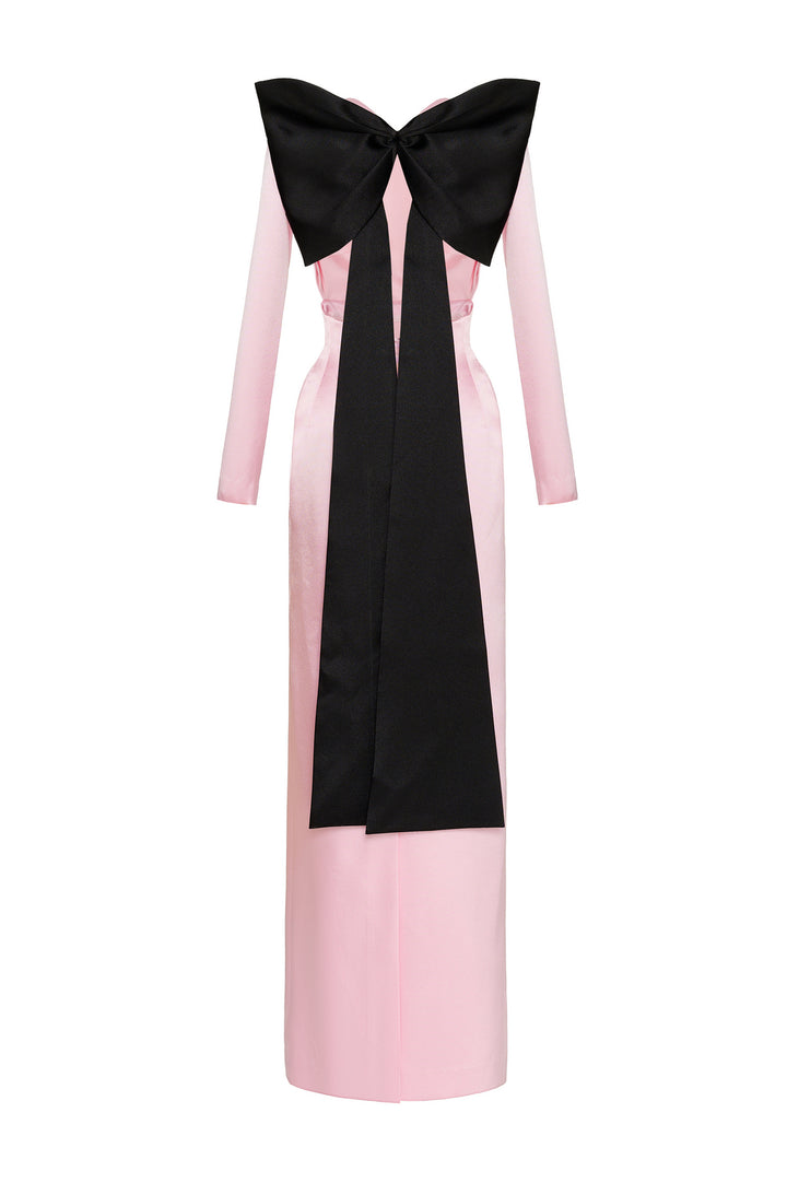 Elevate your evening with the dress, designed with a striking square shoulder silhouette that offers a modern and structured look. The cut-out waist adds a flattering touch of allure while maintaining elegance. A dramatic oversized bow at the back completes the design, creating a sophisticated statement perfect for formal occasions. Crafted from smooth satin, this dress combines timeless luxury with bold detailing for a refined and confident appearance.