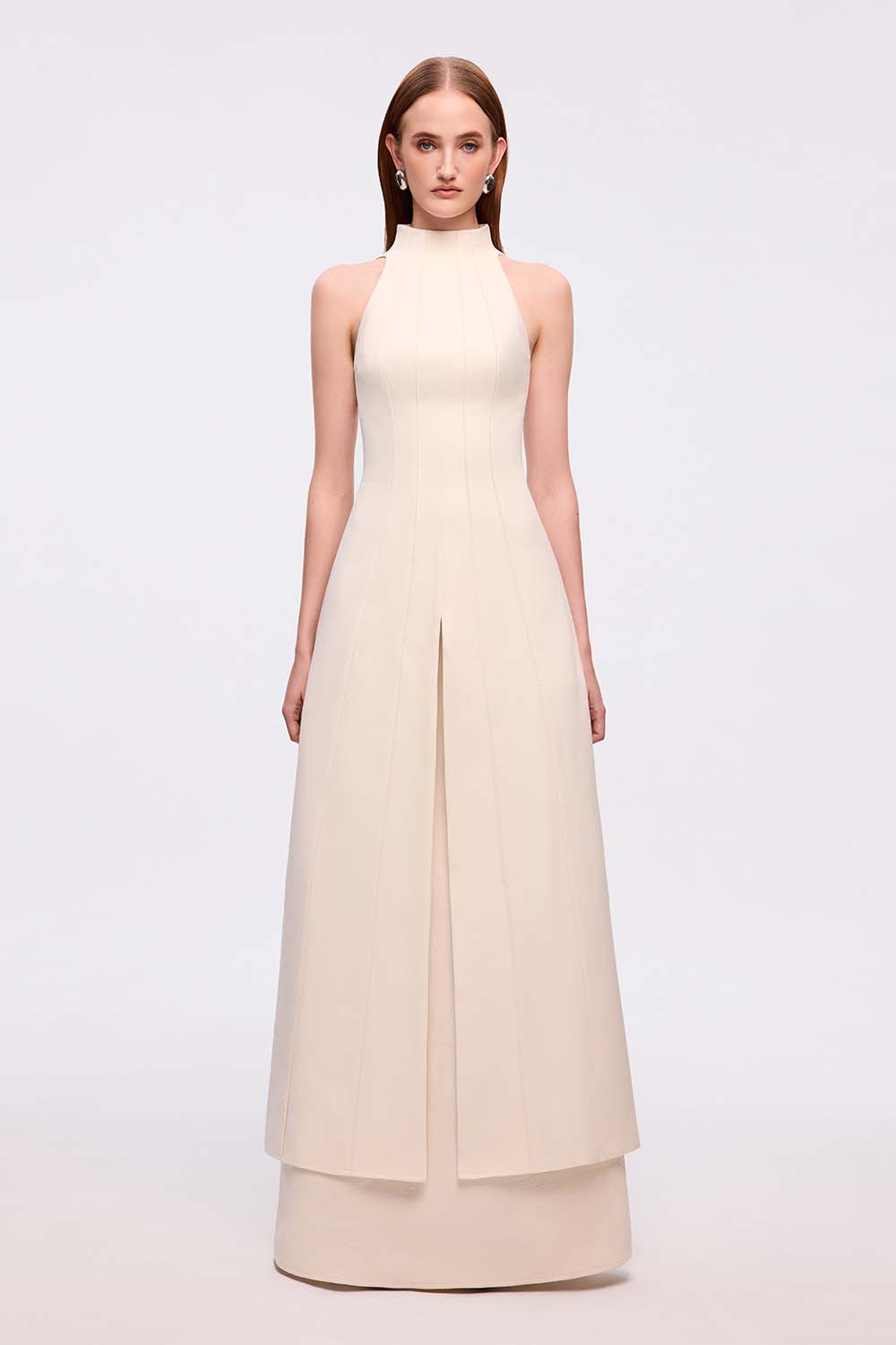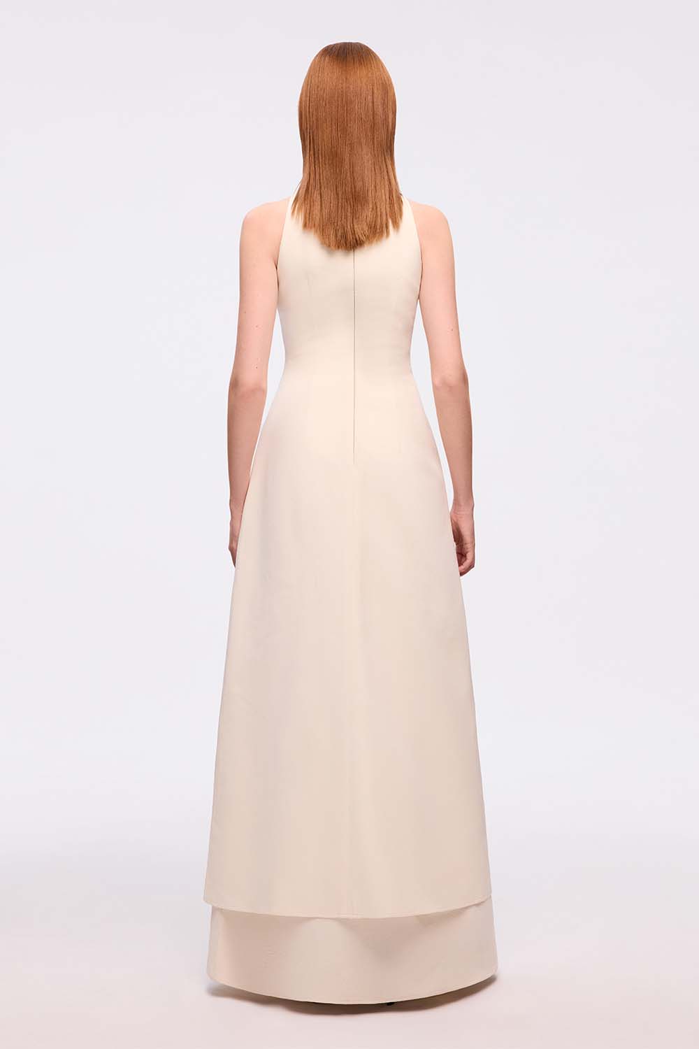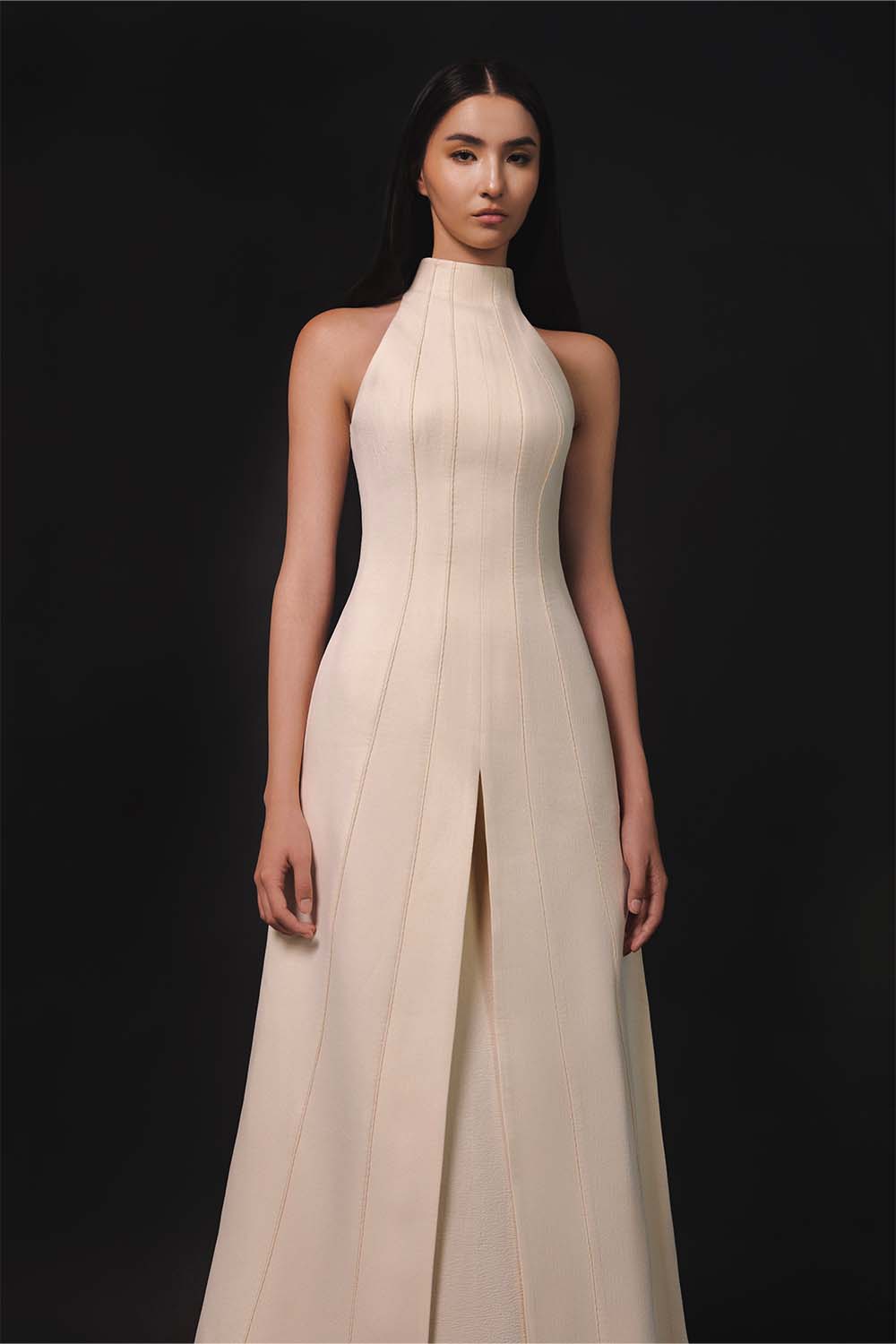 The halterneck design is complemented by precise paneling and edgestick seams, ensuring a clean, sharp appearance. A central front slit (inspired by Vietnamese "ao tu than") adds a cultural touch to the classic design. The dress is enhanced by interlining, creating a structured form that maintains its shape, while the fabric’s natural texture adds depth to its aesthetic. This piece embodies timeless elegance and meticulous craftsmanship, perfect for discerning individuals seeking a versatile yet statement-making dress.