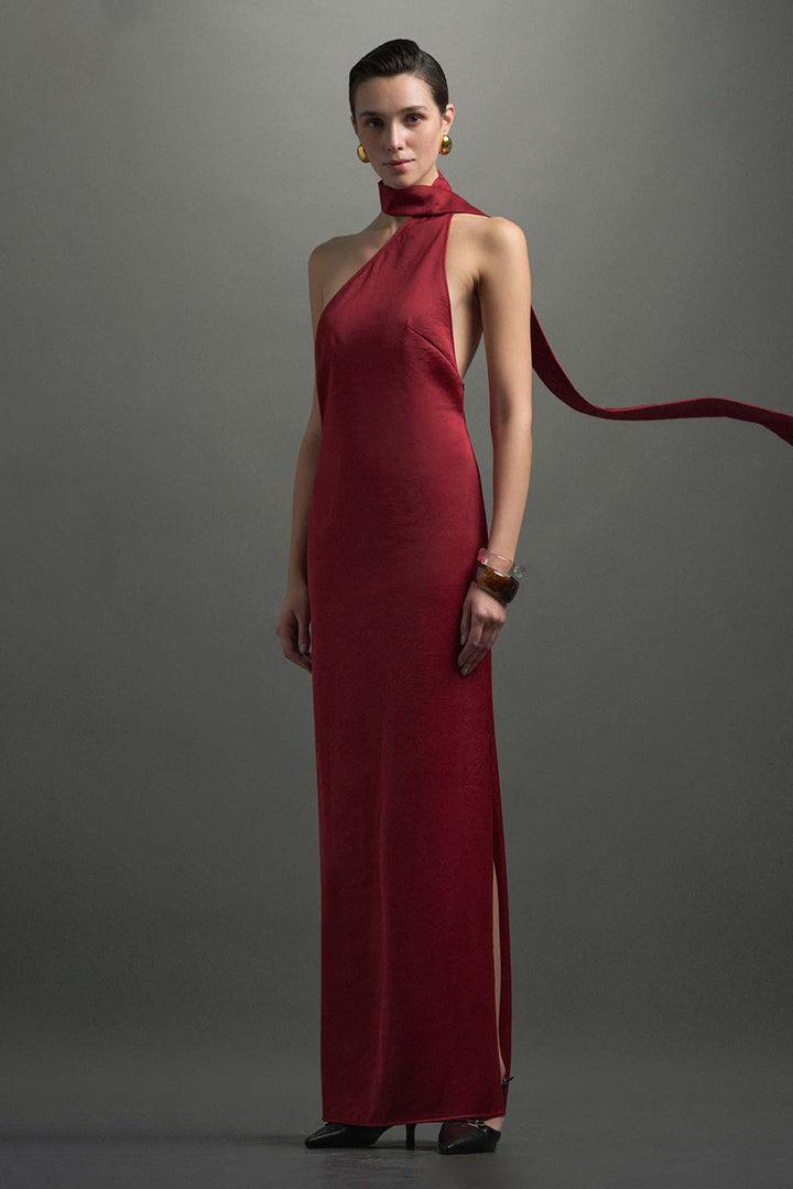 Expertly crafted from luxurious silk, this sheath maxi dress boasts a sophisticated scarf neckline for refined elegance. Its streamlined silhouette flatters every figure. Ideal for upscale events, cocktail parties, or evening soirées, it is the epitome of timeless grace.