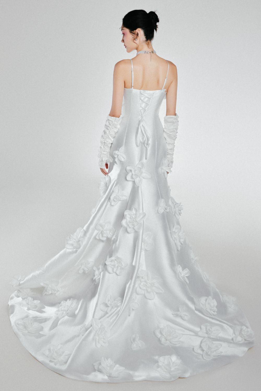 3D floral embellishments, Padded bust, Adjustable sleeve straps, Corset lacing at the back, Dart lines