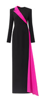 This silk crepe dress features an elegant asymmetric extended flap design, adding a modern touch to the classic floor length silhouette. The unique design provides a flattering and comfortable fit for any occasion. Elevate your wardrobe with this stylish and versatile dress.