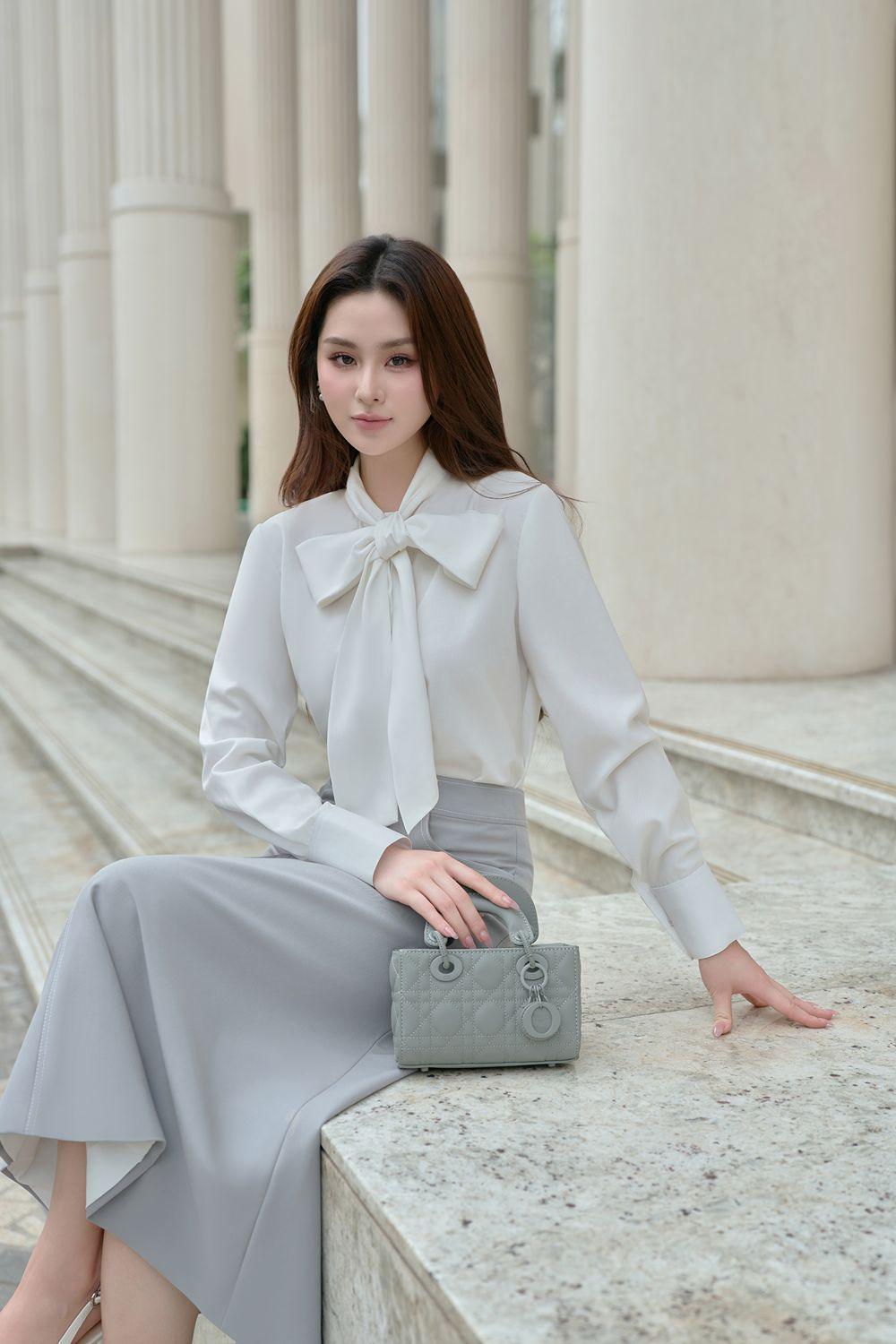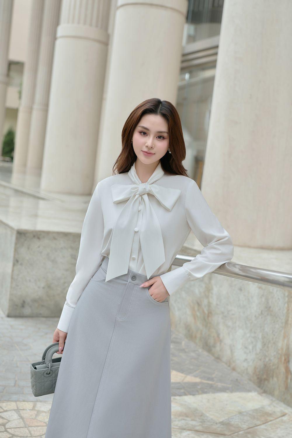 Bow tie on the neck, Slit cuff with buttons row, High waist, White topstitching detail, Two front-facing pockets, Front fly zipper with button