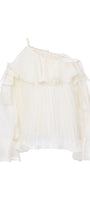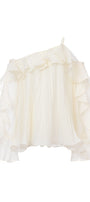 The top features an elegant off-shoulder design paired with a delicately pleated bodice, creating a refined silhouette. Crafted from lightweight organza, this top offers a subtle sheen and structured shape, while the blouson fit and ruffle trim add a sophisticated, feminine touch. Ideal for elevating both casual and formal ensembles with expert styling versatility.
